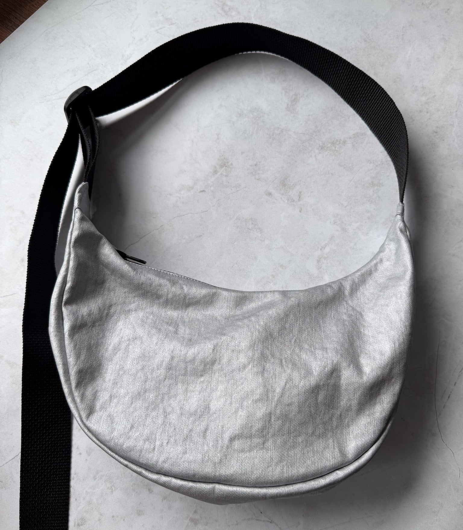 I literally gasped when I saw this fabric on the deadstock market because it's just ridiculously cool and unique! So metallic fabrics are almost always polyester and cheaply made but this is a 100% COTTON denim that just happens to have a metallic silver coating?? So we natural fiber fabric girlies CAN have an outrageously cool metallic fabric? Wow. Count me in. Literally, I took some home already and made a Crosstown Crescent Bag by Graco Makes for a holiday gift. I did (foolishly) do a hot wash and hot dry with my sample fabric and it got rumply and wrinkly from shrinking so I'd advise that you do a cold wash and hang dry but note that because this is cotton and not poly, the texture may change slightly after washing and drying. I still love the added texture though of my gift sew so do a hot wash if you want more texture!
