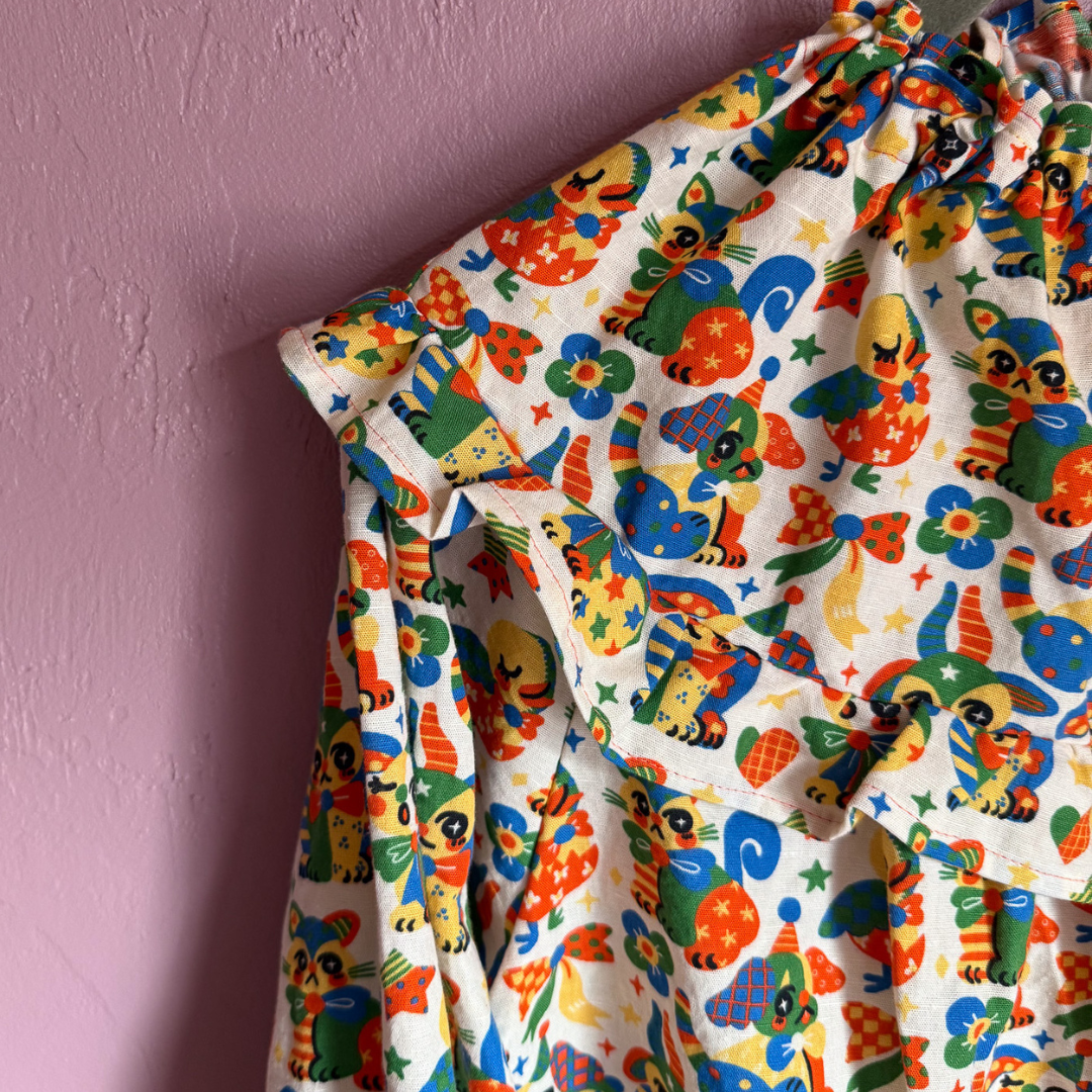 Nostalgia is such a fun and lighthearted primary-color print that gives a 90s vibe in the best way. Featuring cute little clown like animals, they are certainly having a 'party' amongst the darling little stars, sparkles and flowers.